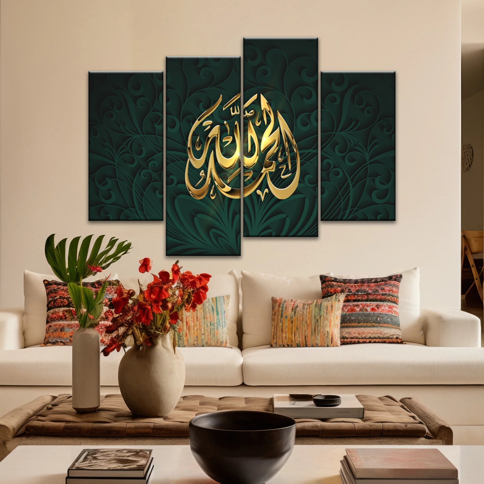 Enhance your living environment with the splendid Islamic Wall Art adorned with gilded Quranic script portraying the revered appellation of Allah. This enchanting masterpiece radiates sophistication and devoutness, embodying a graceful symbol of dedication and belief.